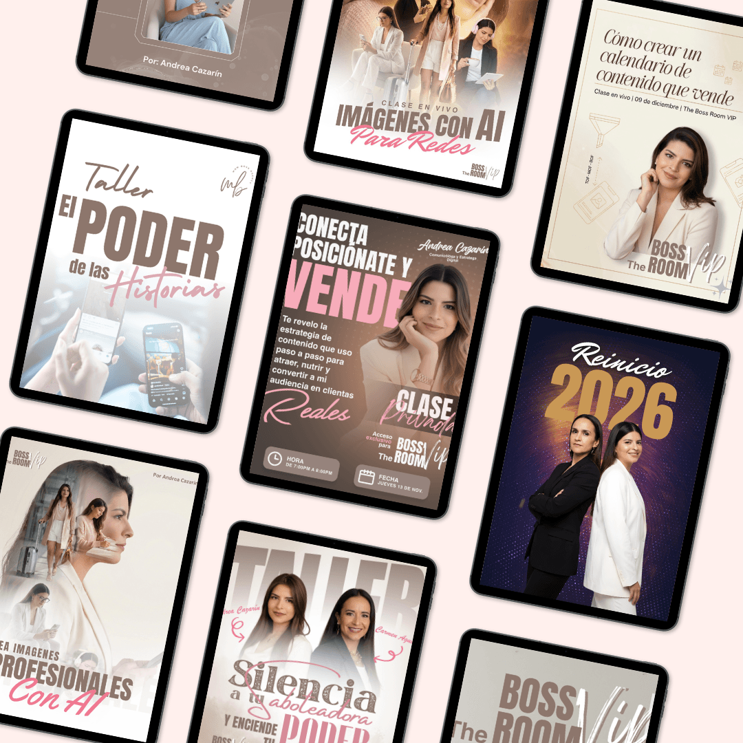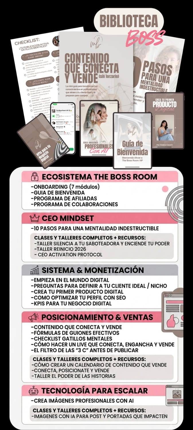 The Boss Room VIP te enseña desde cómo construir tu marca personal, crear tu primer producto digital o servicio, hasta cómo comunicar y vender de forma natural.
