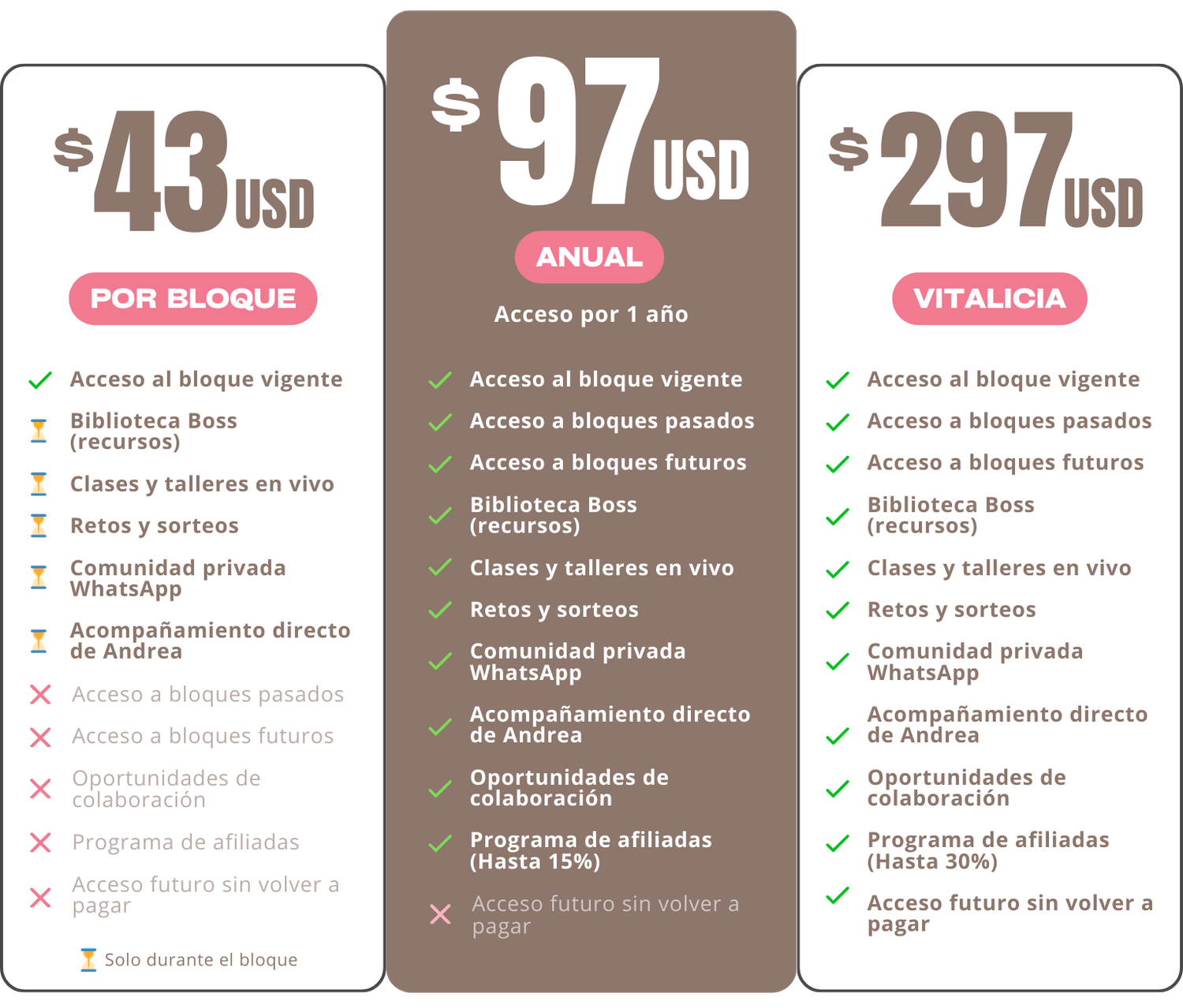 Tendrás acompañamiento directo, retos accionables, clases en vivo y acceso a la Biblioteca Boss mientras dure el bloque.